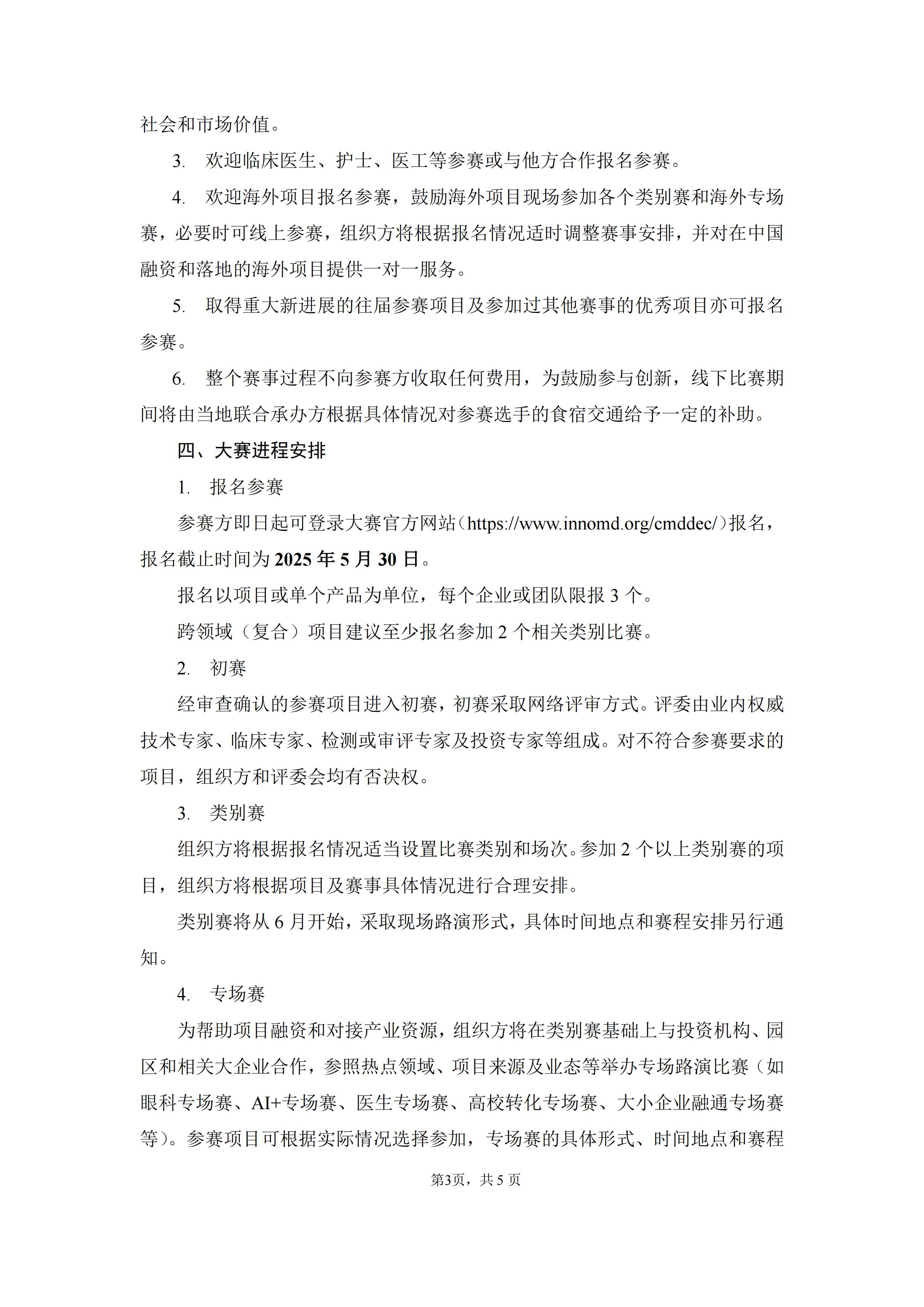 参赛方即日起可登录大赛官方网站(医疗器械创新网网://dxstxq.com/cmddec/)报名,报名截止时间为2025年5月30日。
